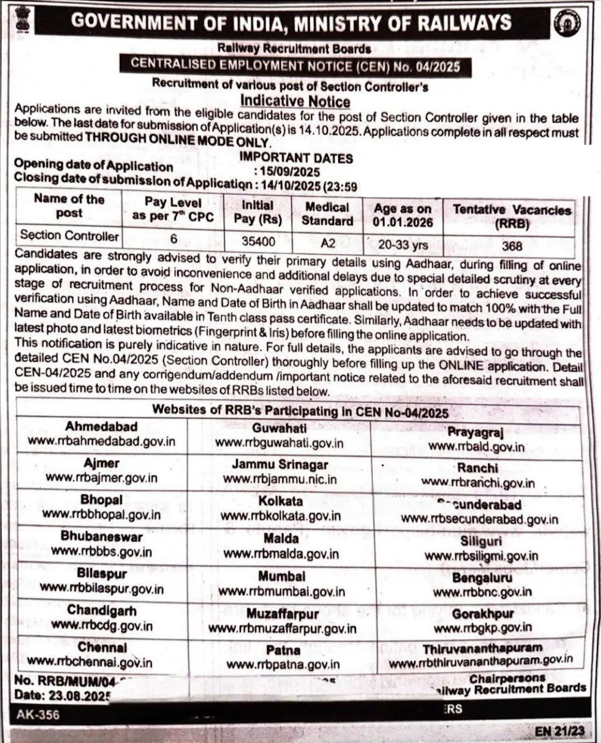 - Question: What is the last date to apply for RRB Section Controller Recruitment 2025?